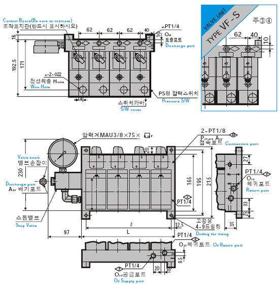 | VF-MD is manual(Pilot Air) Valve Unit. Direction Control Valve operated by Air Pilot is feeding is stop, Pressure is kept for a long time(Normal open). Non-Leak type. Therefore, though Oil time. It is used with HMS power.