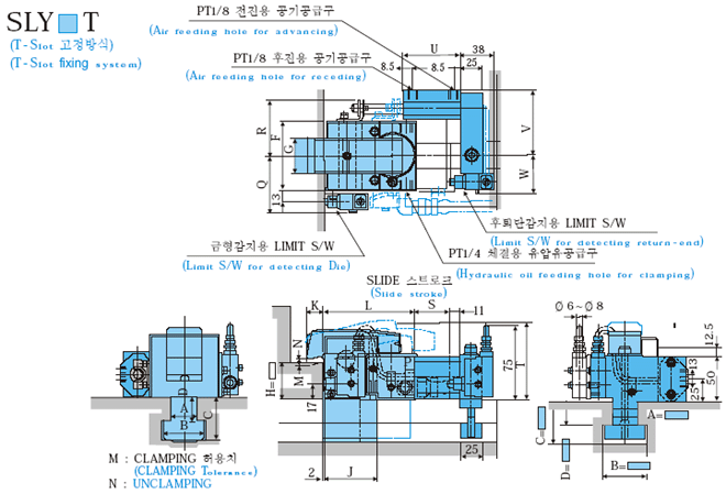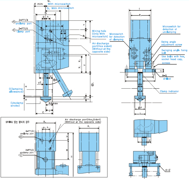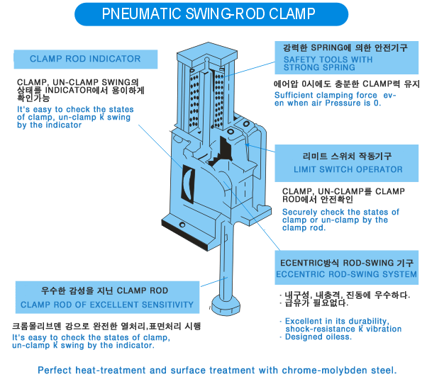 This gives strong clamping force in its compact body due to its simple mechanism of air eccentric system and accordingly is in full consideration of its durability and shock-resistance. Its clamping increases the output of air cylinder by its eccentric system, thereby giving a great pulling & retaining force to the clamp rod. In particular, the upperTN-H Type with strong spring in its air cylinder has sufficient retaining force even though air feeding is shut off then securing its full safety with no Die falling evenduring press pause. An indicator is set in front of the main clamp, enabling to externally check, with ease,the conditions of clamp, un-clamp, & swing. With Limit S/W(LED) for checking clamp or un-clamp setting on its standard, the secure interlock is made up and it's very simple to repair the function of its each part.
