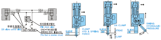 1) UNCLAMP - Back Moving(Return) Motion Fig. indicates the state of finished clamping. If, in this state, you Put Hydraulic Valve (SOL.C) ON, it should return to the tank by the built-in spring of Clamp④ . Clamp④ is loosened to the un-clamp direction and, it is fully loosened and in between Die is a space(it is controlled by the Timer in Electric Circuit But there is the case to divide two motions by using the Push Button on the operating system instead of the Timer), put the Solenoid Valve(SOL.C) ON & put Air-cylinder ID into operating backward(upward) and make Clamp④ moved back to the return-end ,then Limit S/W or Proximity S/W⑦ being operated. ※ Note : In case of operating Press without using Clamp, please put Hydraulic Valve(SOL.C) OFF at the return-end position and do Clamp. (But, excluding the kind with the condition of auto clamping at the return-end)