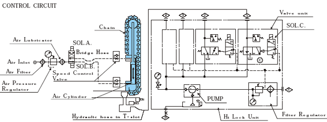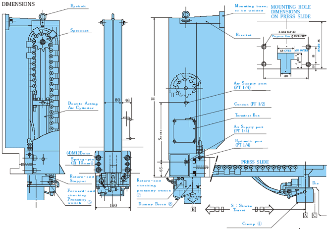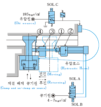 2) CLAMP - Forward Moving Motion In case of clamping Dummy Plate⑧ at the return-end, first put Hydraulic Valve (SOL,C) ON & un-clamp Clamp④ longer than 2mm(It is controlled by the Timer in electric circuit. There is the case to divide two motions by using the Push Button on the operating system instead of the Timer), put the Solenoid Valve(SOL.C) ON & put Air-Cylinder 1 into operating forward(downward) and make Clamp④ moved forward to Die the ⓐ and, after Limit S/W for detecting Die or Proximity S/W⑤ is operated, put Hydraulic Valve(SOL.C) OFF and do clamp Die. But, if no Die, it will go forward to C and Limit S/W or Proximity S/W⑤ will not be operated.